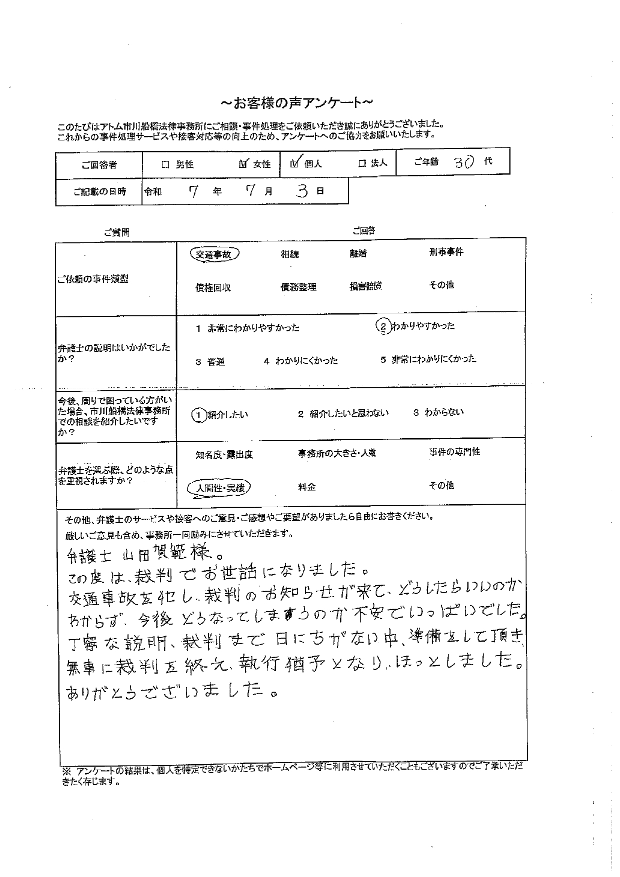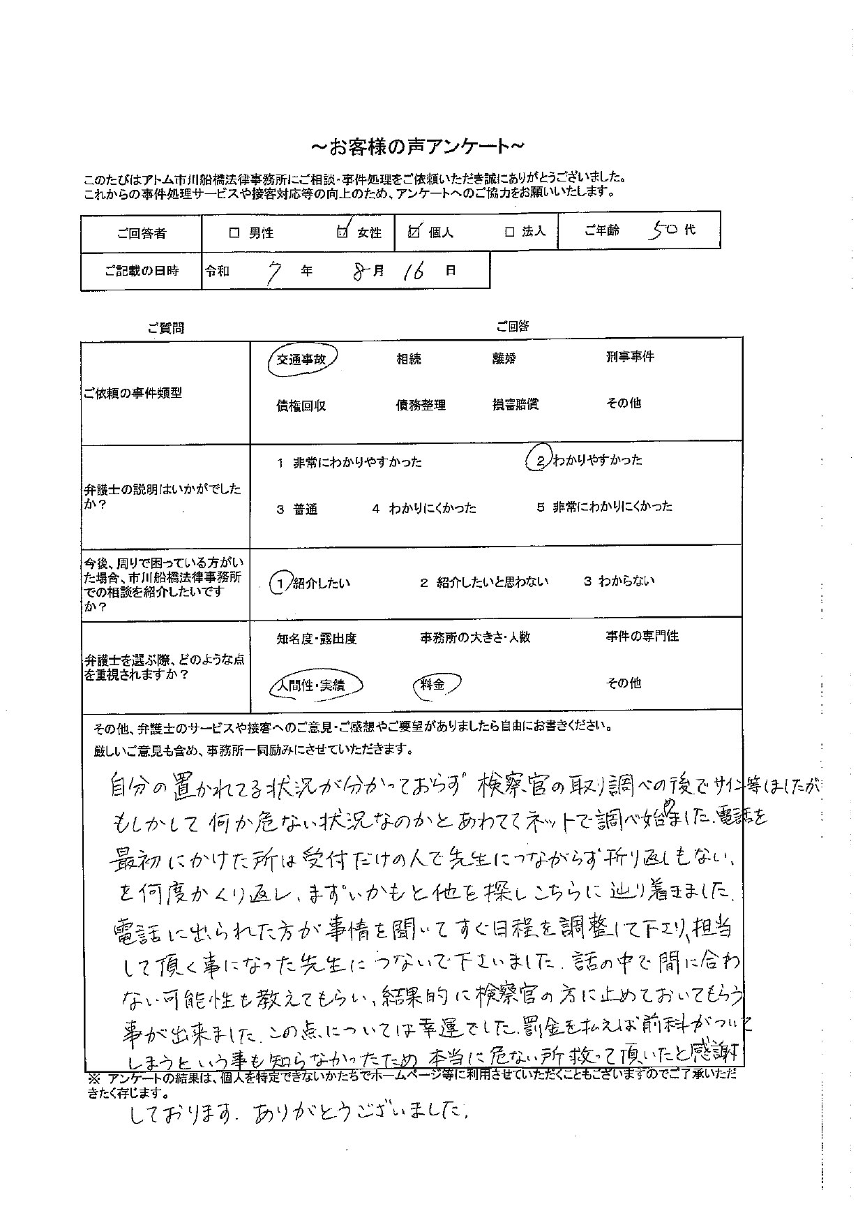 今回は過失運転致死の件でお願いしました。 担当の山田弁護士さんには大変お世話になりました。
