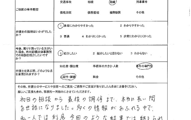 最初の1番不安なときにお話ができ、聞いていただき分かりやすくご説明と適確なご指摘をいただき、安心できました。