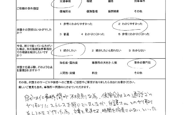 自分は仕事時間が不規則な為、保険会社との通話でのやり取りにストレスを感じていましたが、弁護士さんとのやり取りをLINEで行った為、文章を見直せる、時間を拘束されない、といったところにありがたみを感じま...