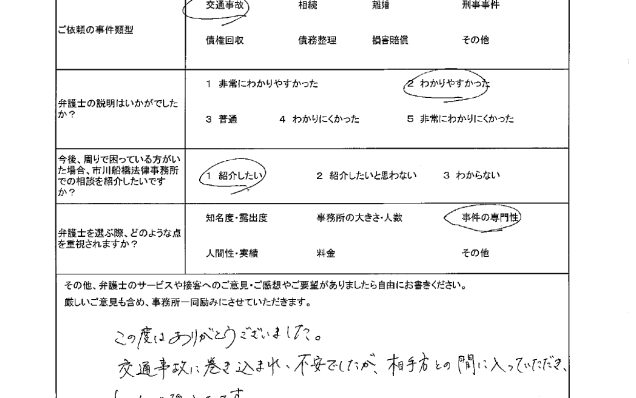交通事故に巻き込まれ、不安でしたが、相手方との間に入っていただき、とても心強かったです。