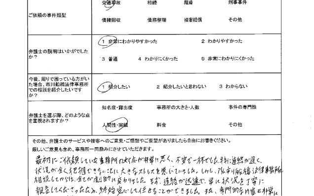 最初にご依頼していた事務所の対応が非常に悪く、不安で一杯でした。特に連絡が遅く、状況が全く把握できないことに大きなストレスを感じていました。